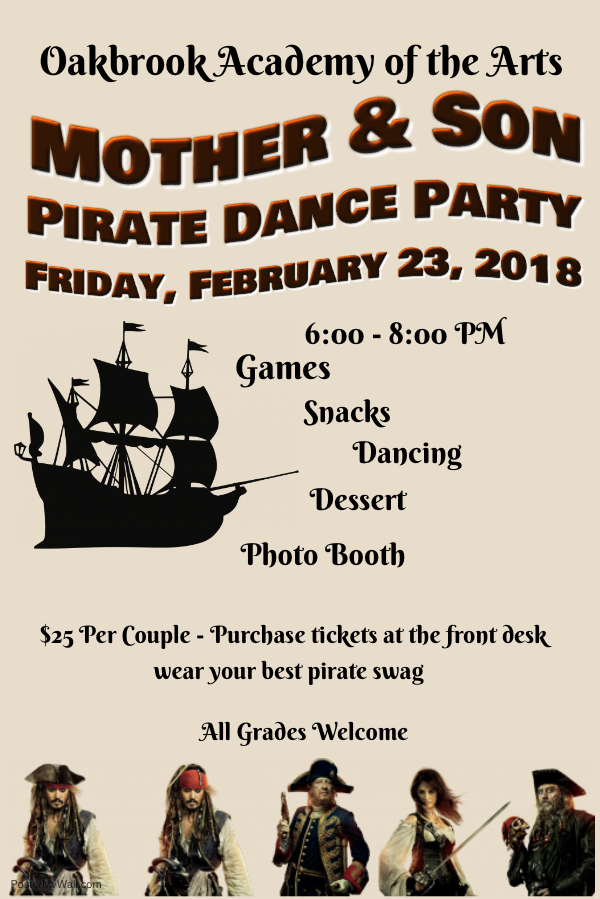Mother Son Pirate Dance Party is sure to be a blast. Wear your pirate gear and come have fun with games, dancing, dessert and a photo booth.
